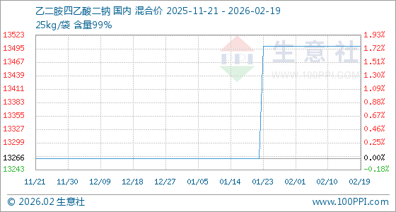 2月19日,生意社乙二胺四乙酸二钠基准价为13500.00元/吨,与本月初持平。