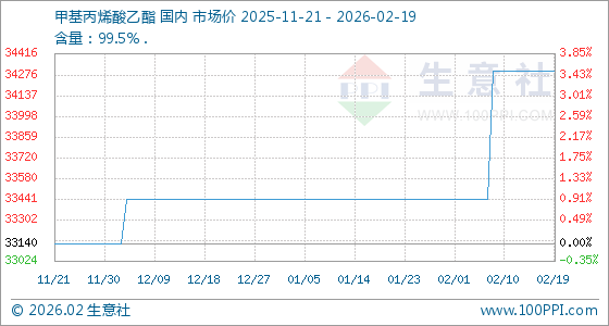 2月19日,生意社甲基丙烯酸乙酯基准价为34300.00元/吨,与本月初(33440.00元/吨)相比,上涨了2.57%。