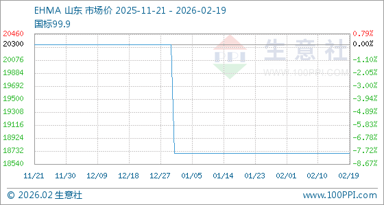 2月19日,生意社EHMA基准价为18700.00元/吨,与本月初持平。