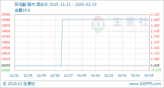 2月19日,生意社环戊酮基准价为25000.00元/吨,与本月初持平。