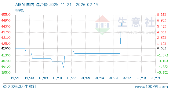 2月19日,生意社AIBN基准价为45000.00元/吨,与本月初持平。