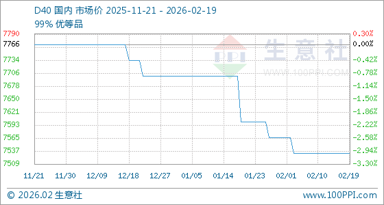 2月19日,生意社D40基准价为7533.33元/吨,与本月初(7566.67元/吨)相比,下降了0.44%。