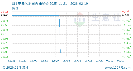 2月19日,生意社四丁基溴化铵基准价为25233.33元/吨,与本月初持平。