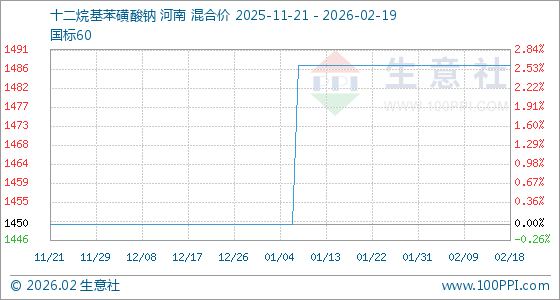 2月19日,生意社十二烷基苯磺酸钠基准价为1487.50元/吨,与本月初持平。