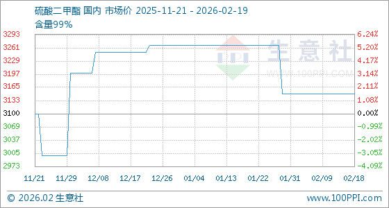 2月19日,生意社硫酸二甲酯基准价为3150.00元/吨,与本月初持平。