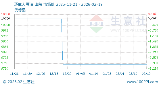 2月19日,生意社环氧大豆油基准价为9750.00元/吨,与本月初持平。