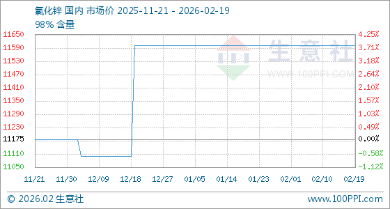 2月19日,生意社氯化锌基准价为11600.00元/吨,与本月初持平。