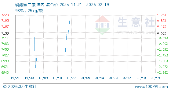 2月19日,生意社磷酸氢二铵基准价为7200.00元/吨,与本月初持平。