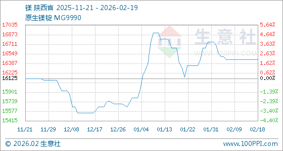 2月19日,生意社镁基准价为16450.00元/吨,与本月初(16750.00元/吨)相比,下降了1.79%。