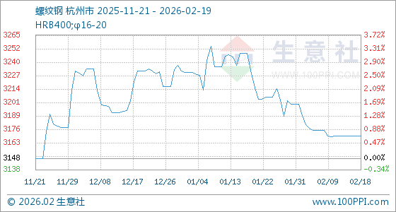 2月19日,生意社螺纹钢基准价为3170.00元/吨,与本月初(3200.34元/吨)相比,下降了0.95%。