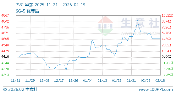 2月19日,生意社PVC基准价为4616.00元/吨,与本月初(4640.00元/吨)相比,下降了0.52%。