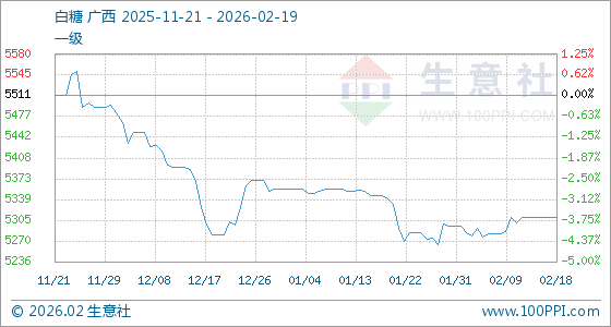 2月19日,生意社白糖基准价为5310.00元/吨,与本月初(5295.00元/吨)相比,上涨了0.28%。