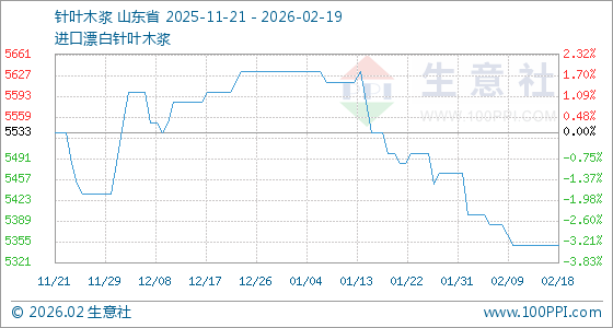 2月19日,生意社针叶木浆基准价为5350.00元/吨,与本月初(5466.67元/吨)相比,下降了2.13%。