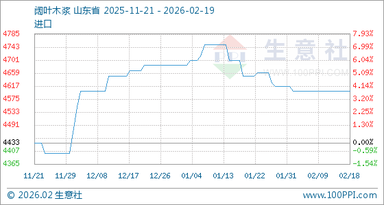 2月19日,生意社阔叶木浆基准价为4600.00元/吨,与本月初(4616.67元/吨)相比,下降了0.36%。