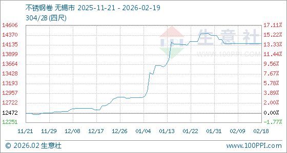 2月19日,生意社不锈钢卷基准价为14162.50元/吨,与本月初(14360.00元/吨)相比,下降了1.38%。