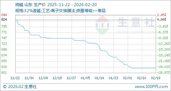 2月20日,生意社烧碱基准价为622.00元/吨,与本月初(636.00元/吨)相比,下降了2.2%。