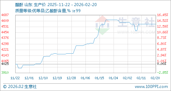 2月20日,生意社醋酐基准价为4565.00元/吨,与本月初(4590.00元/吨)相比,下降了0.54%。