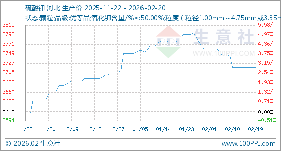 2月20日,生意社硫酸钾基准价为3716.67元/吨,与本月初(3760.00元/吨)相比,下降了1.15%。
