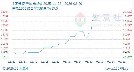 2月20日,生意社丁苯橡胶基准价为13125.00元/吨,与本月初(13133.33元/吨)相比,下降了0.06%。