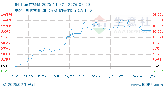 2月20日,生意社铜基准价为100356.67元/吨,与本月初(104496.67元/吨)相比,下降了3.96%。
