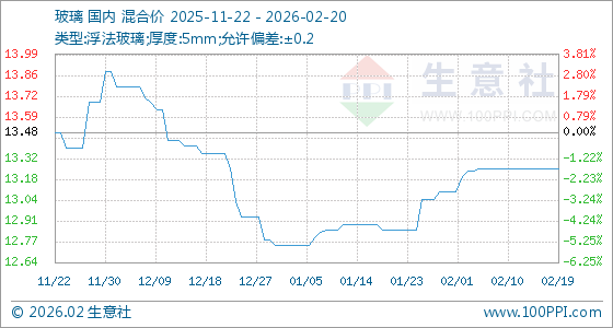 2月20日,生意社玻璃基准价为13.25元/平方米,与本月初(13.10元/平方米)相比,上涨了1.15%。