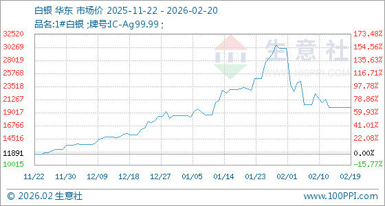 2月20日,生意社白银基准价为19954.33元/千克,与本月初(30098.67元/千克)相比,下降了33.7%。
