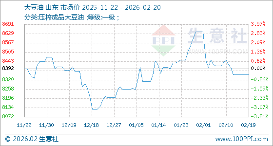 2月20日,生意社大豆油基准价为8354.00元/吨,与本月初(8640.00元/吨)相比,下降了3.31%。