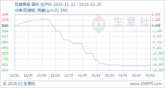 2月20日,生意社瓦楞原纸基准价为2680.00元/吨,与本月初持平。