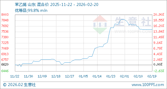 2月20日,生意社苯乙烯基准价为7594.00元/吨,与本月初(7874.00元/吨)相比,下降了3.56%。