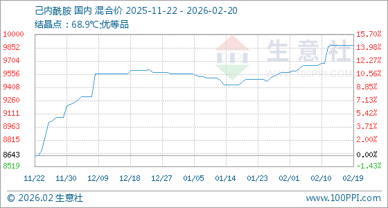 2月20日,生意社己内酰胺基准价为9876.67元/吨,与本月初(9573.33元/吨)相比,上涨了3.17%。