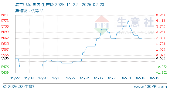 2月20日,生意社混二甲苯基准价为5650.00元/吨,与本月初(5740.00元/吨)相比,下降了1.57%。