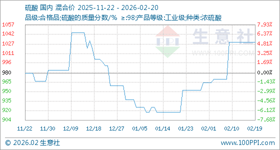 2月20日,生意社硫酸基准价为1030.00元/吨,与本月初(965.00元/吨)相比,上涨了6.74%。