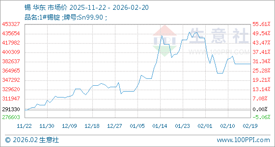 2月20日,生意社锡基准价为378420.00元/吨,与本月初(427370.00元/吨)相比,下降了11.45%。