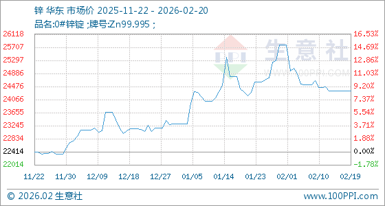 2月20日,生意社锌基准价为24330.00元/吨,与本月初(25776.00元/吨)相比,下降了5.61%。