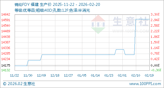 2月20日,生意社锦纶FDY基准价为14600.00元/吨,与本月初(14325.00元/吨)相比,上涨了1.92%。