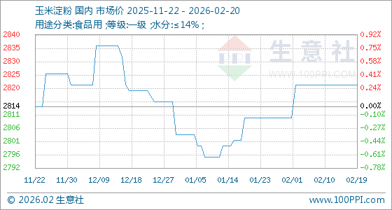 2月20日,生意社玉米淀粉基准价为2822.00元/吨,与本月初(2810.00元/吨)相比,上涨了0.43%。