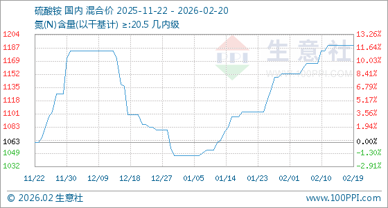 2月20日,生意社硫酸铵基准价为1190.00元/吨,与本月初(1153.33元/吨)相比,上涨了3.18%。