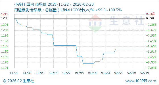2月20日,生意社小苏打基准价为1187.50元/吨,与本月初持平。