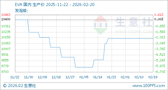 2月20日,生意社EVA基准价为10150.00元/吨,与本月初持平。