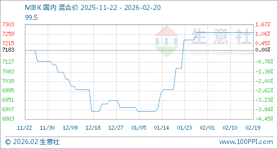 2月20日,生意社MIBK基准价为7266.67元/吨,与本月初持平。