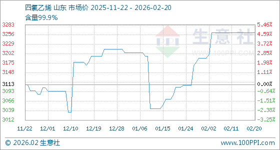 2月20日,生意社四氯乙烯基准价为3261.11元/吨,与本月初(3188.89元/吨)相比,上涨了2.26%。