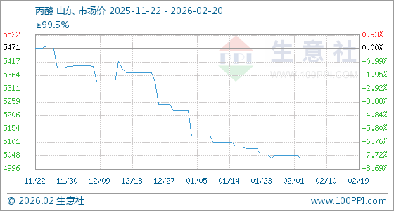 2月20日,生意社丙酸基准价为5040.00元/吨,与本月初(5046.25元/吨)相比,下降了0.12%。