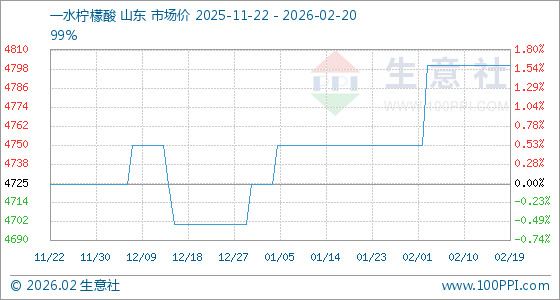 2月20日,生意社一水柠檬酸基准价为4800.00元/吨,与本月初(4750.00元/吨)相比,上涨了1.05%。