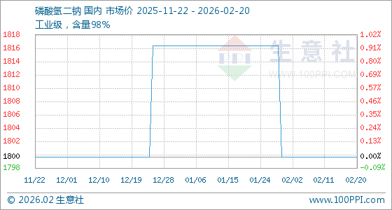 2月20日,生意社磷酸氢二钠基准价为1800.00元/吨,与本月初持平。