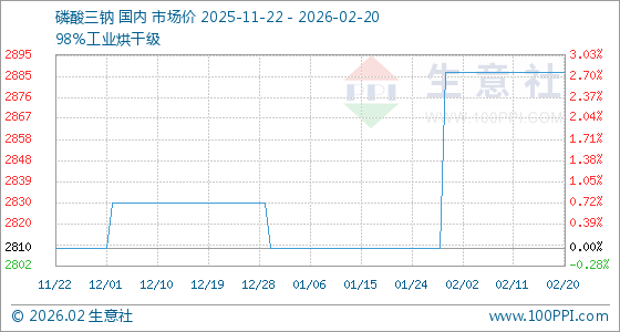 2月20日,生意社磷酸三钠基准价为2887.50元/吨,与本月初持平。