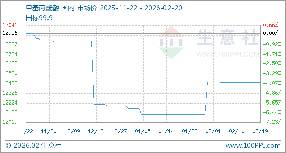 2月20日,生意社甲基丙烯酸基准价为12440.00元/吨,与本月初(12448.57元/吨)相比,下降了0.07%。
