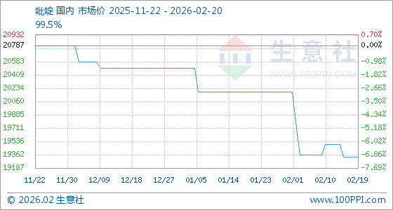 2月20日,生意社吡啶基准价为19333.33元/吨,与本月初(20187.50元/吨)相比,下降了4.23%。