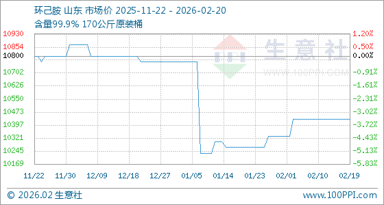 2月20日,生意社环己胺基准价为10433.33元/吨,与本月初(10333.33元/吨)相比,上涨了0.97%。