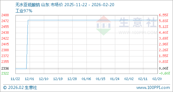 2月20日,生意社无水亚硫酸钠基准价为2475.00元/吨,与本月初持平。