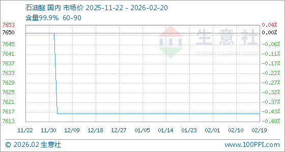 2月20日,生意社石油醚基准价为7616.67元/吨,与本月初持平。